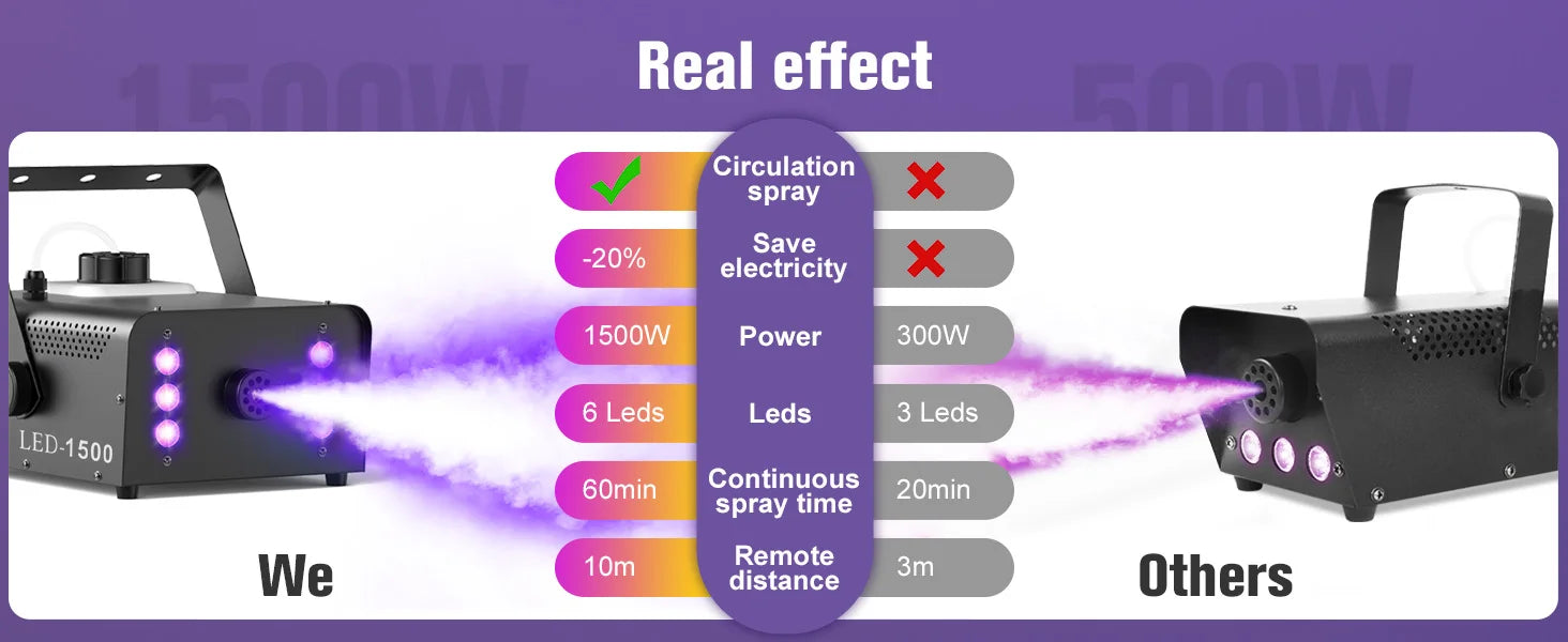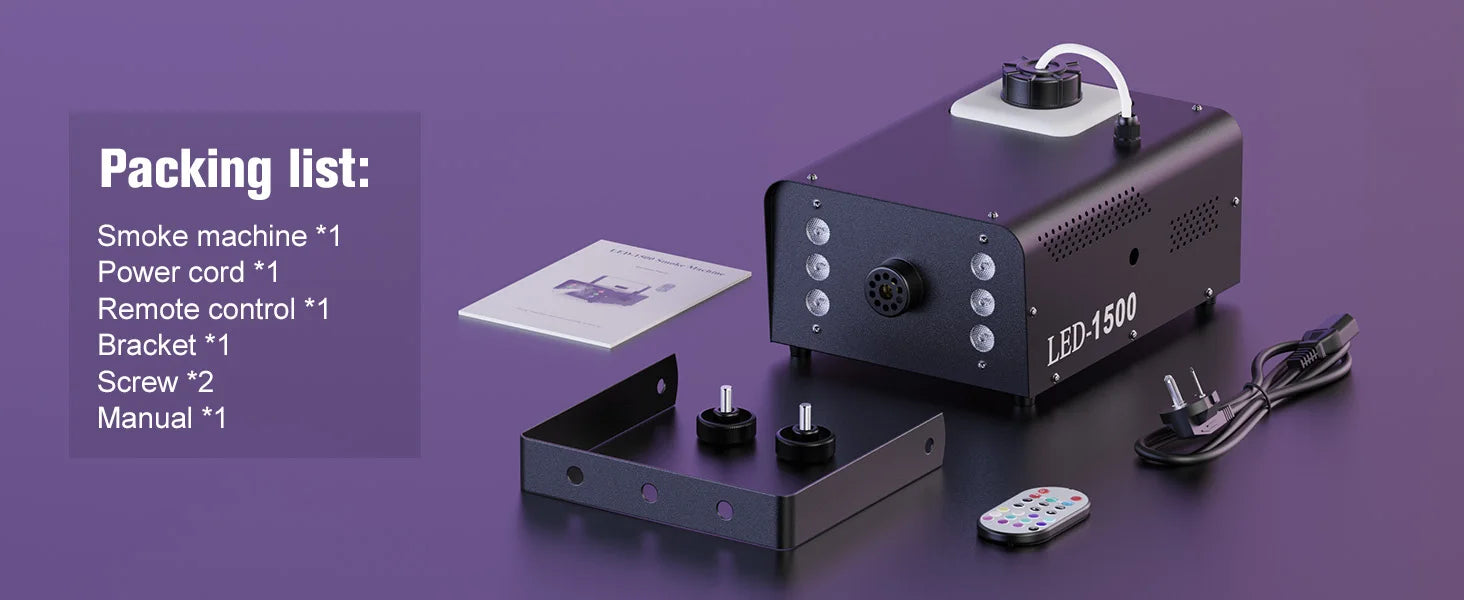 With integrated RGB LEDs and wireless remote control, FogForge 1500 gives you visual impact without complicated setups. Place it on the floor or mount it overhead, trigger fog when needed, and create dramatic moments that feel intentional, immersive, and professional.