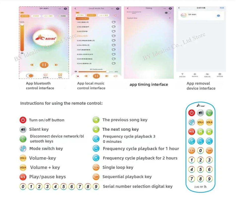 - Includes: speaker, USB cable, AUX cable, charger, remote